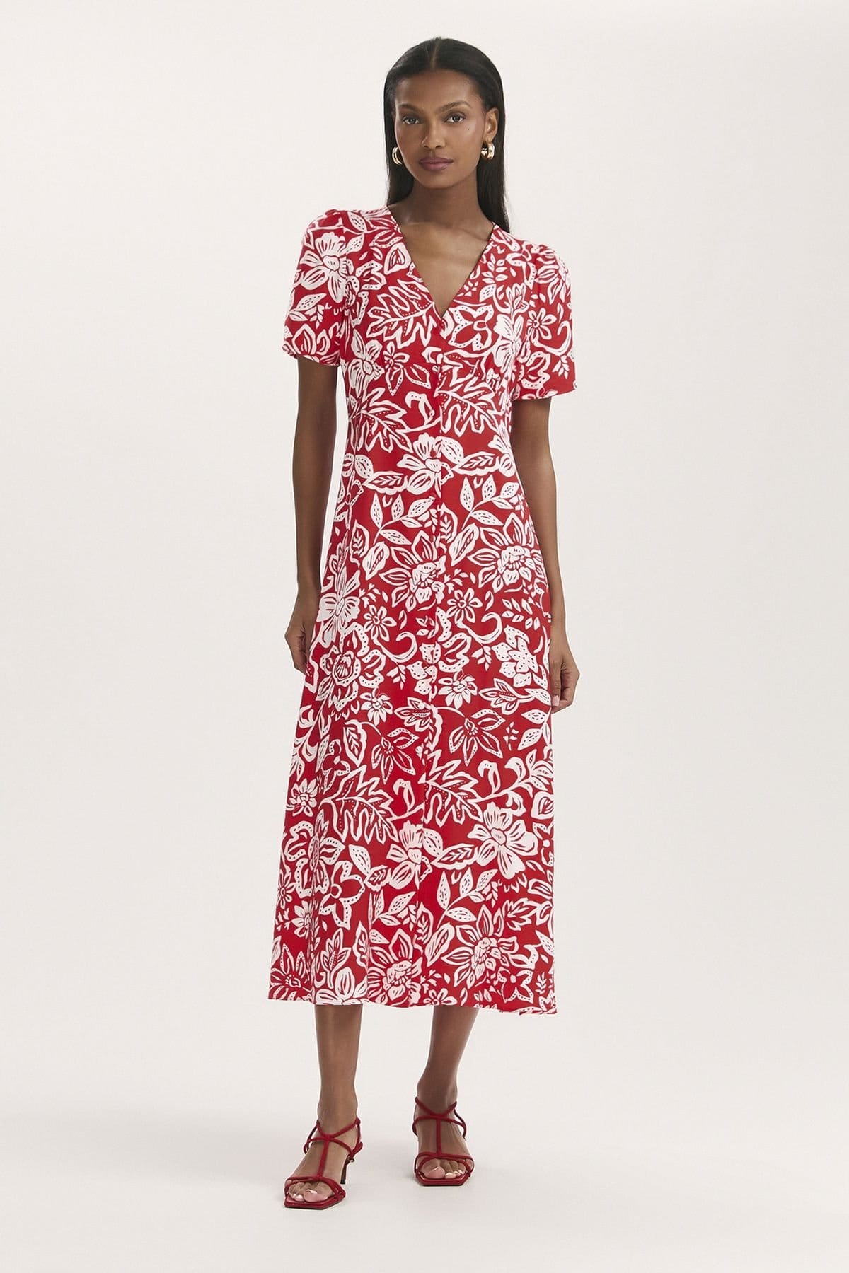 This Floral Midi Dress by Finery London features a V-neckline and short sleeves. Made from crease-free crepe fabric, it offers a versatile fit suitable for any occasion. The scarlet and white floral print adds a touch of elegance.