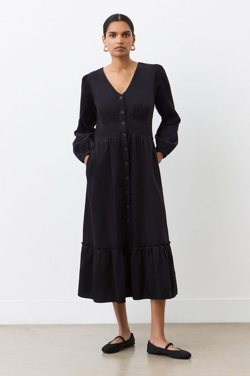 The Finery London Black Corduroy Midi Dress is made from corduroy.