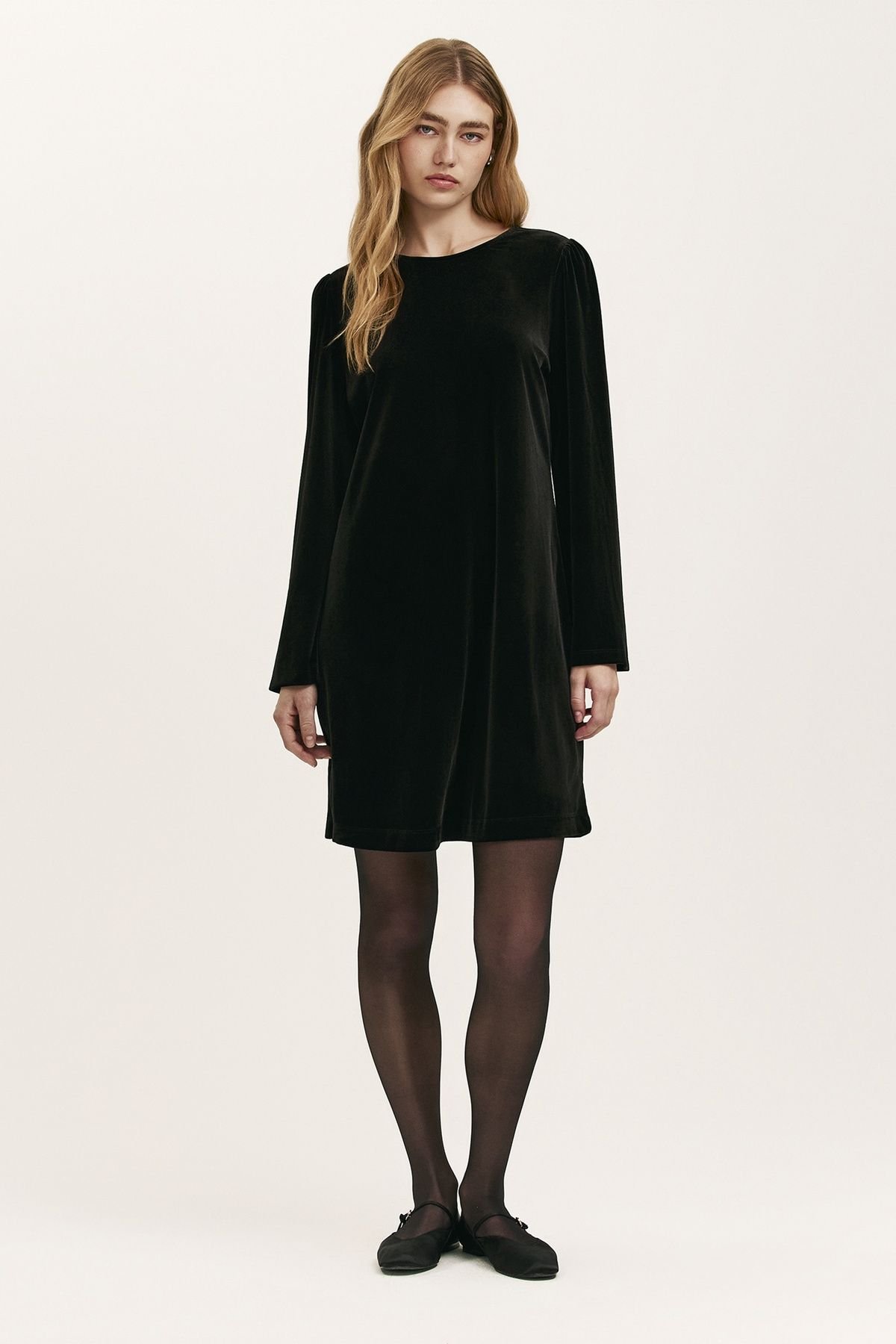 The Finery London True Black Velvet Round Neck Short Dress is made from velvet.