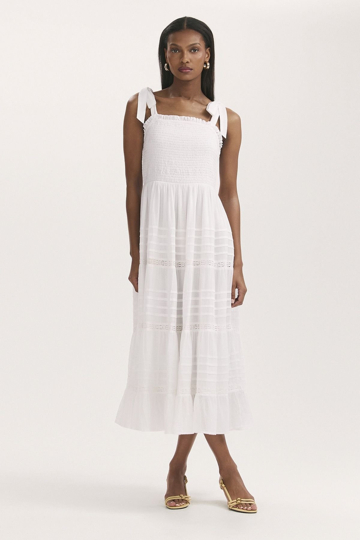 Charming white cotton tiered midi dress with a shirred bodice and self-tie straps. Features pintucks and lace trim for a summery, effortless look. Ideal for casual outings and beachside events.