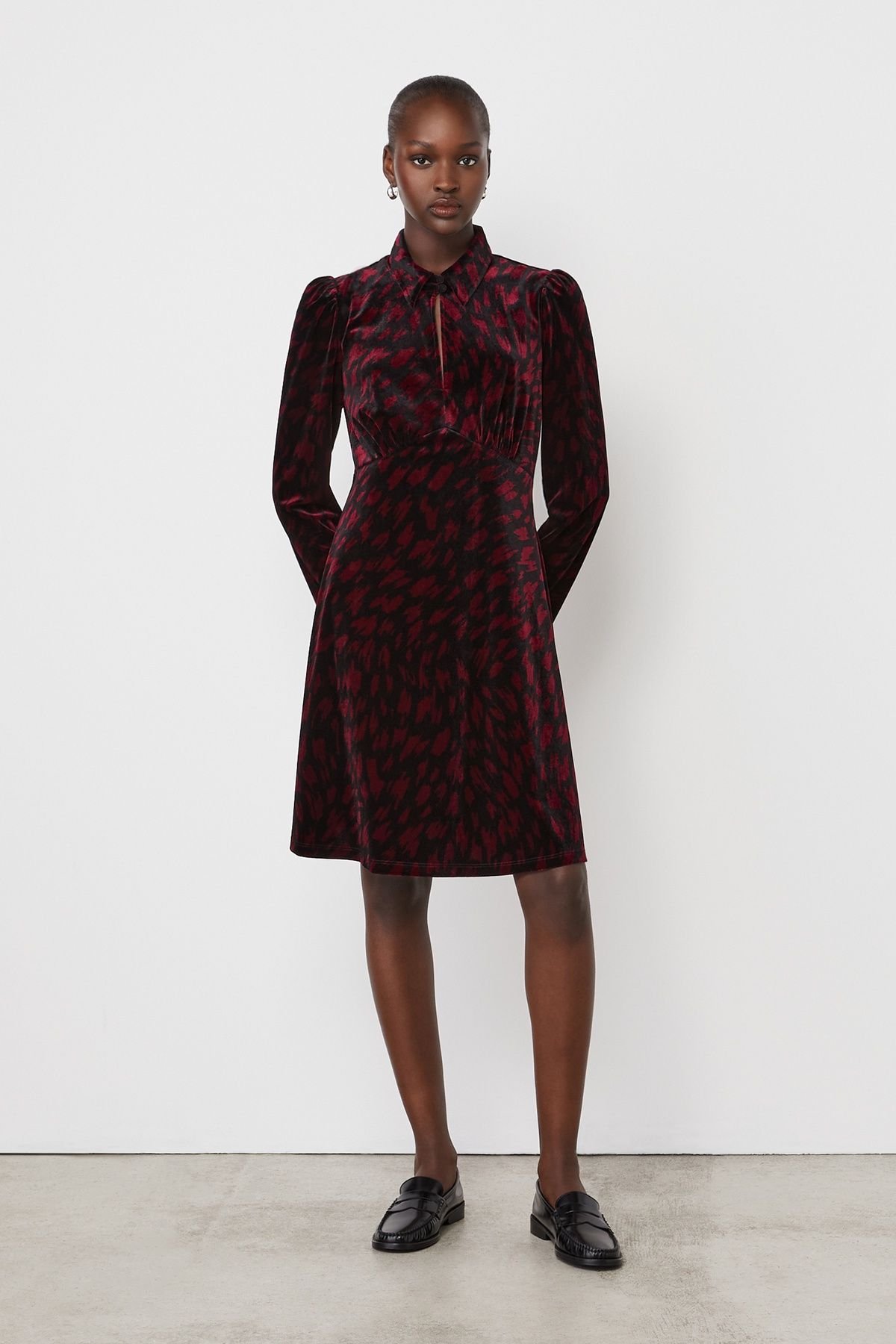 The Finery London Wine Velvet Animal Print Dress is made from velvet.