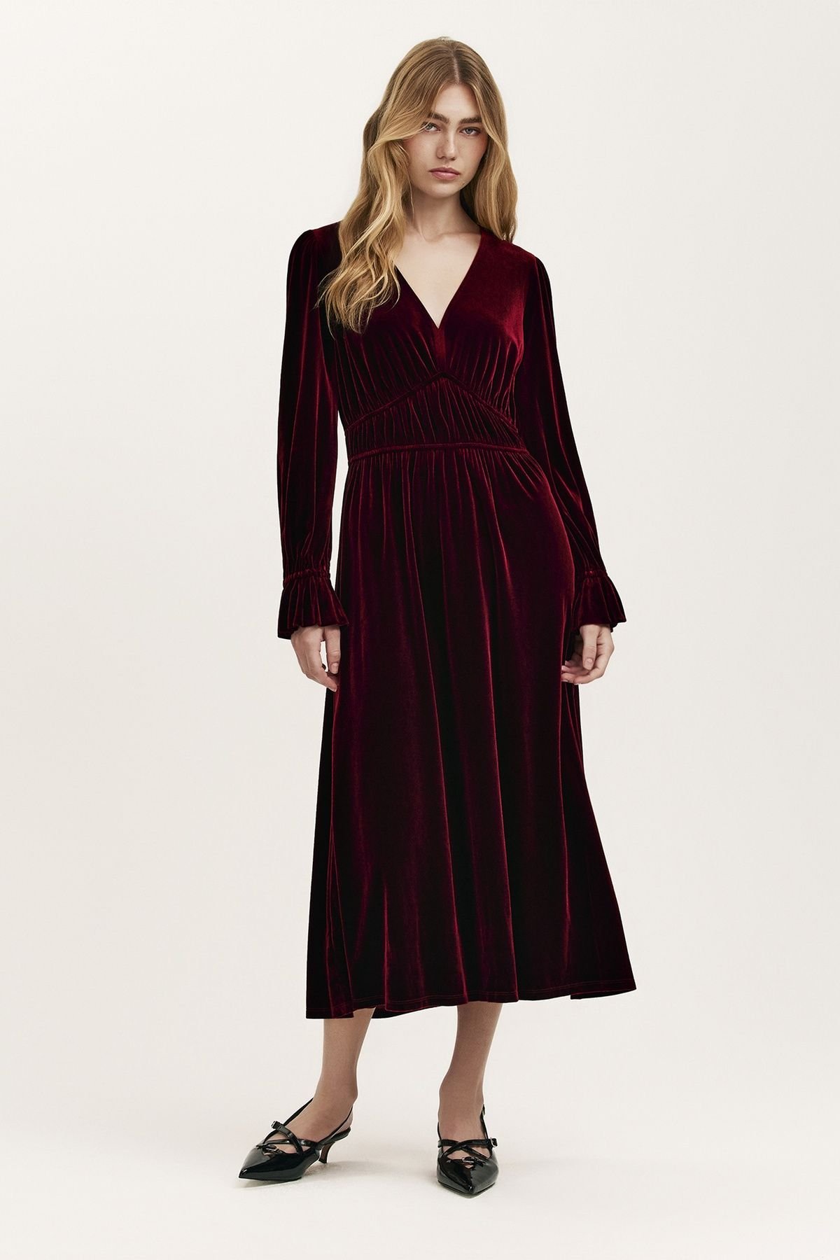 Sophisticated wine velvet midi dress with a plunging V-neckline and shirred elasticated waist. The full-length sleeves and elegant drape make it perfect for evening events.