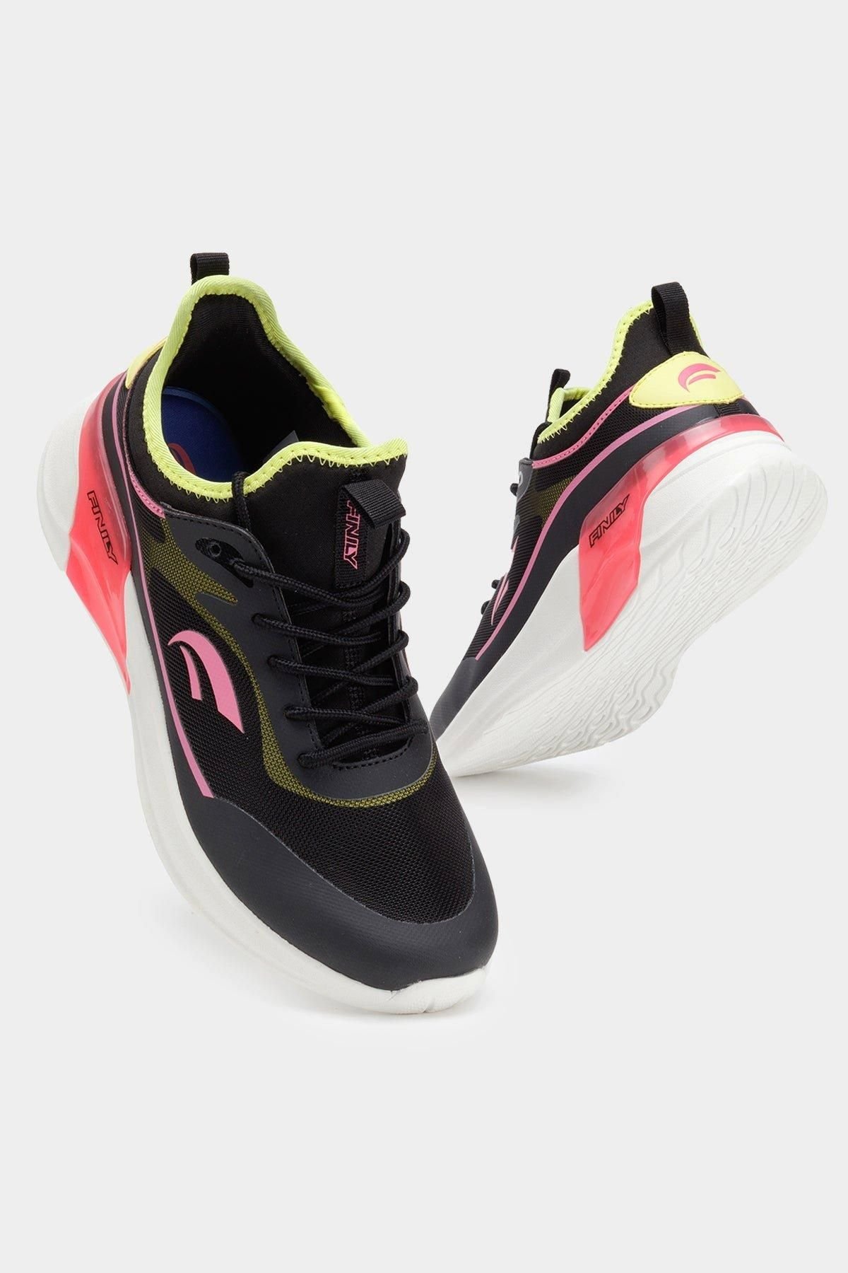 Stylish lace-up runner by Finily in black with vibrant pink and yellow accents. Designed for a relaxed training experience, these trainers feature a mesh upper for breathability and a cushioned sole for comfort.