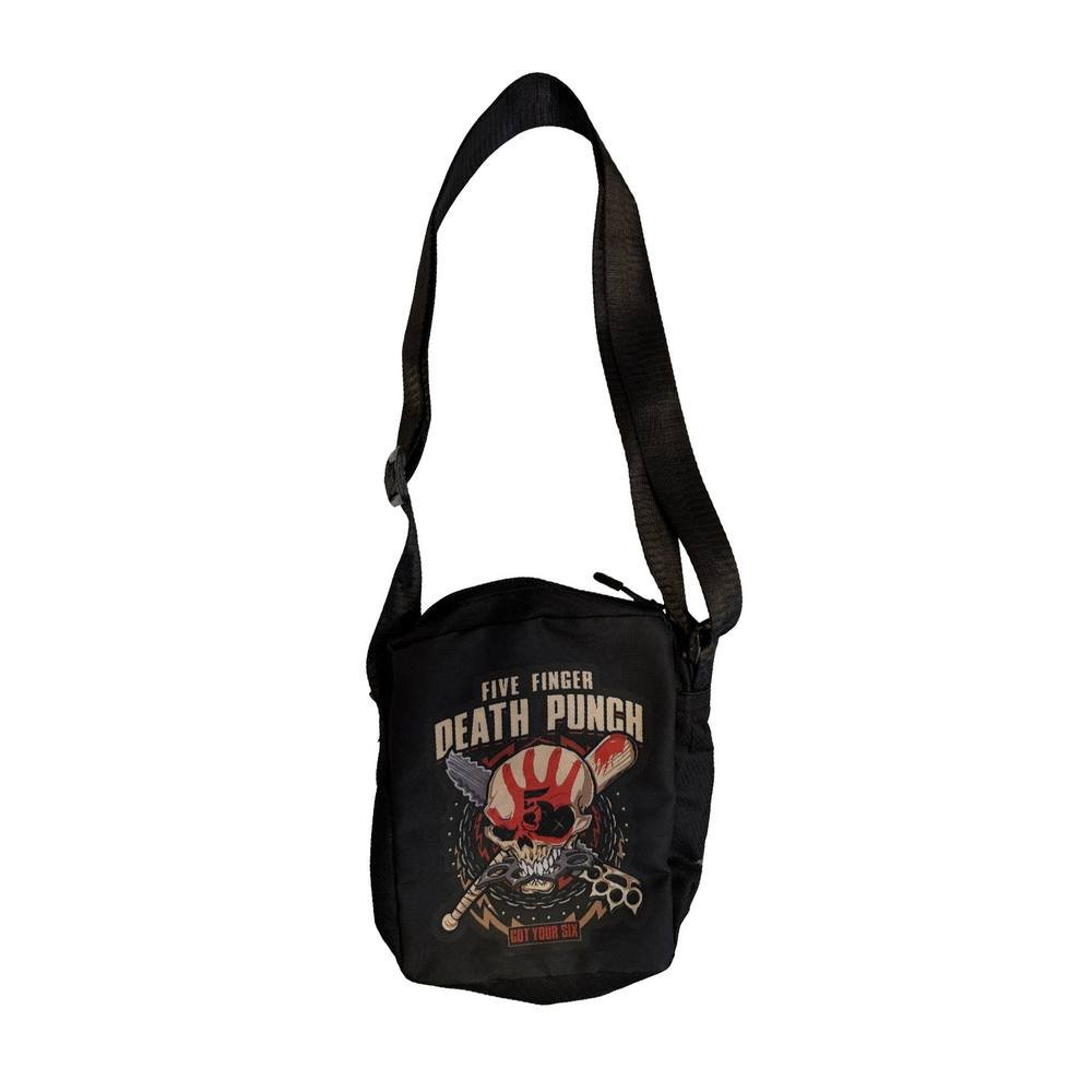 Officially licensed Five Finger Death Punch crossbody bag in black. Made from durable polyester, it features a main zipped compartment and an adjustable shoulder strap. The bag showcases the band's iconic logo and album artwork.