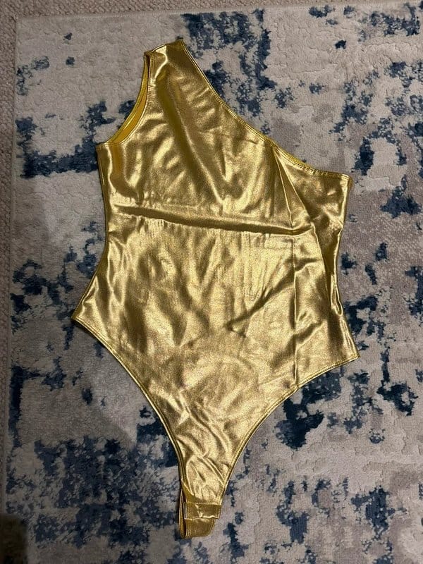 Striking gold metallic bodysuit with a one-shoulder design and ruched side panel. Perfect for a glamorous evening look.