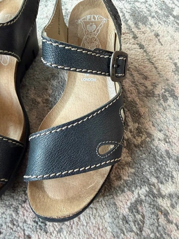 The Fly London Black Leather Wedge Sandals Size 4 is ideal for casual, everyday, summer.