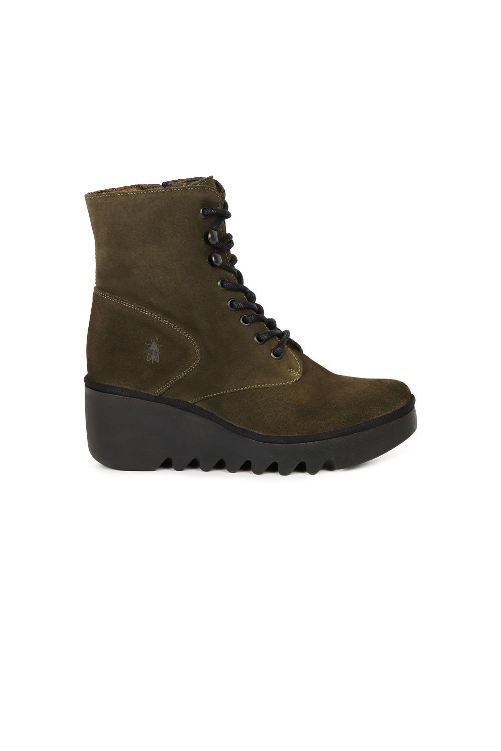 Iconic Fly London Birr ankle boots in khaki leather. Features a cleated wedge heel and dual fastenings of laces and zip for a secure fit. Perfect for outdoor-inspired looks.