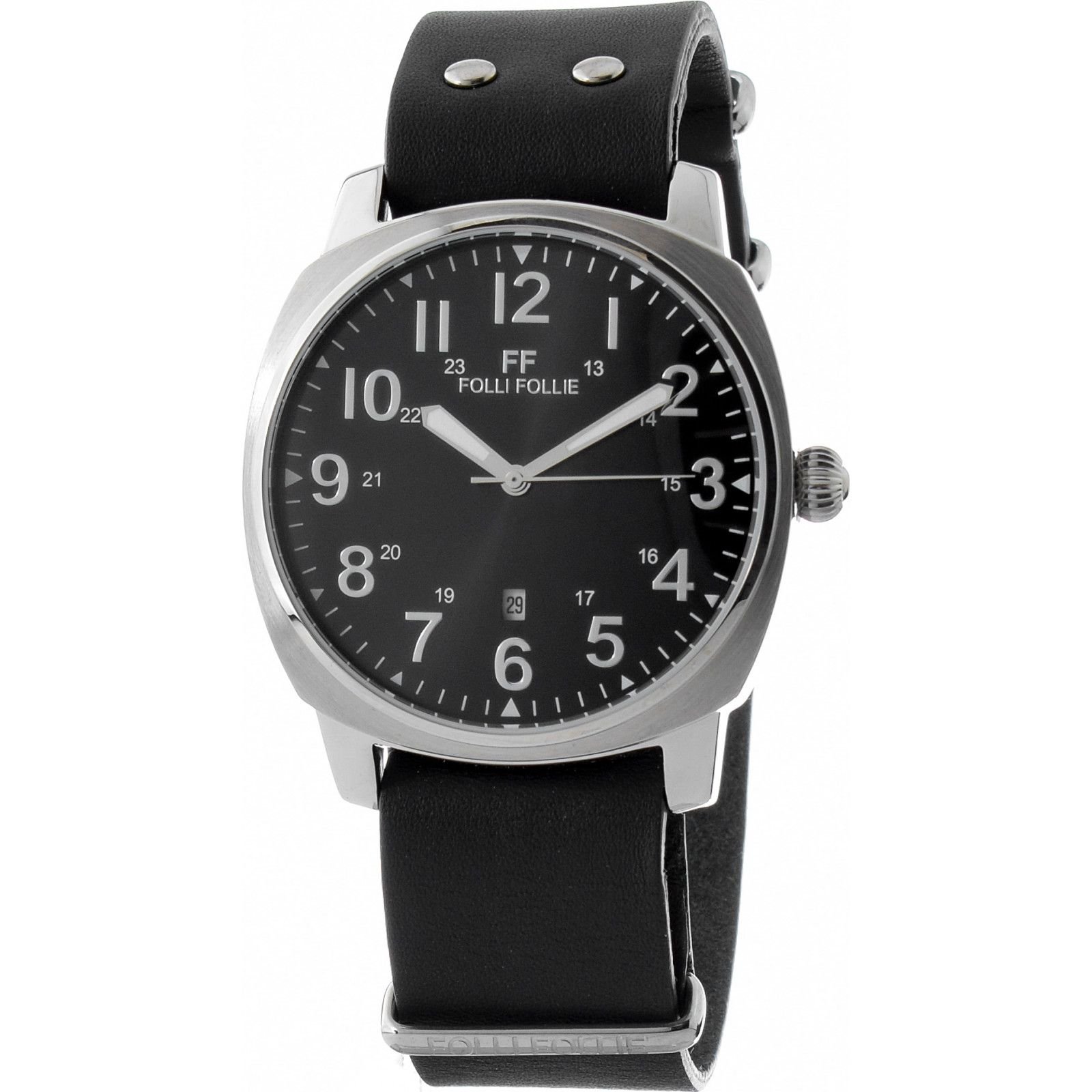 Stylish Folli Follie men's watch in black with a leather strap and silver-tone case. Features a classic analog display and quartz movement for reliable timekeeping. Ideal for both casual and formal occasions.