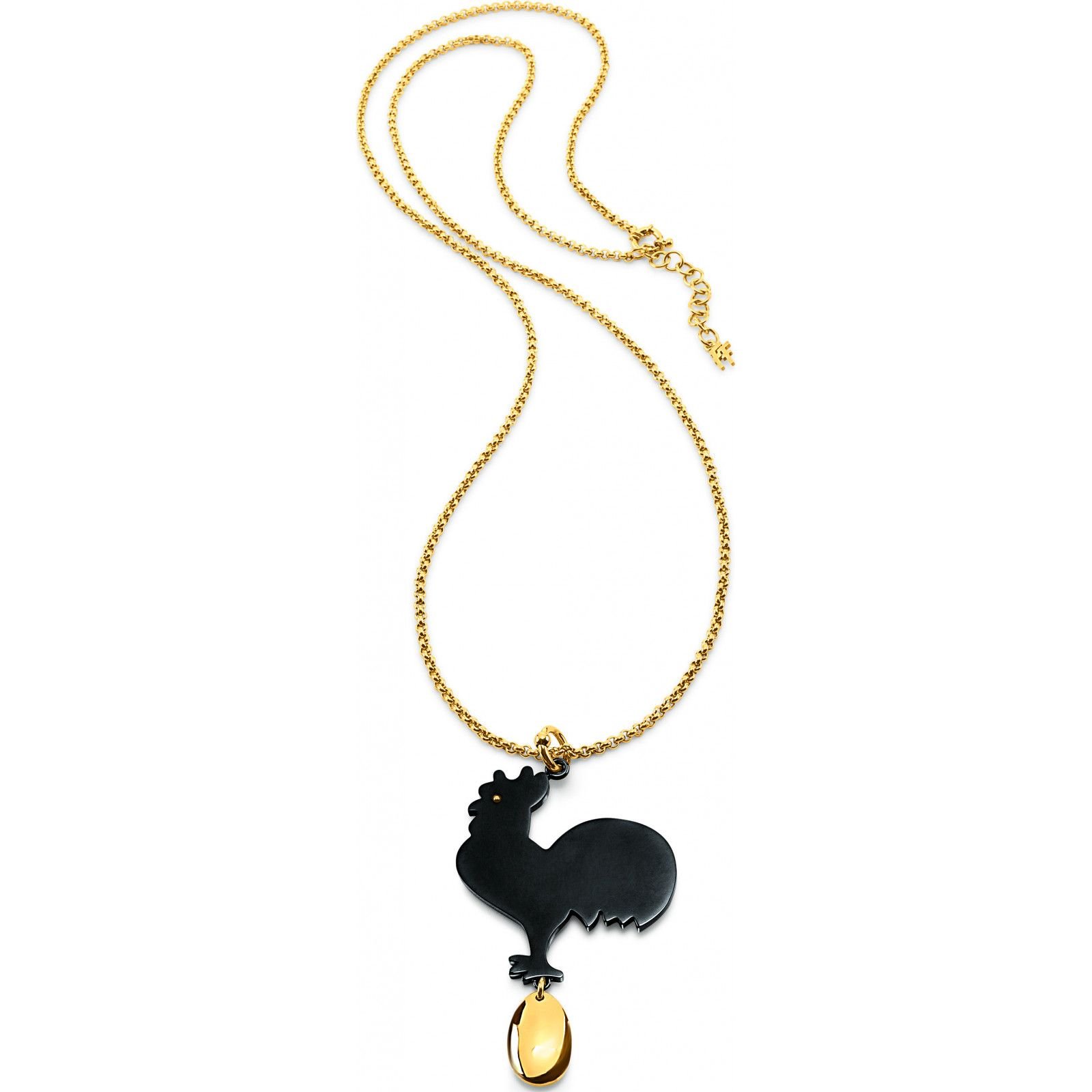 This gold necklace from Folli Follie features a black rooster pendant with a gold egg charm. Crafted with a chain, it adds a touch of boldness to any outfit.