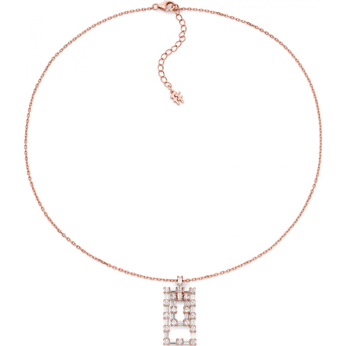 This Folli Follie necklace features a rose gold chain with a square pendant adorned with diamond accents. The design is both elegant and modern, making it a perfect accessory for any occasion.