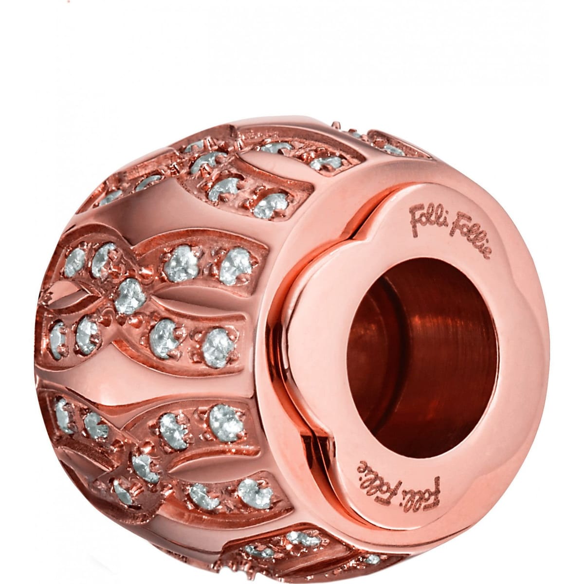 This rose gold charm from Folli Follie features a delicate design adorned with sparkling diamonds. Perfect for adding a touch of elegance to any charm bracelet.