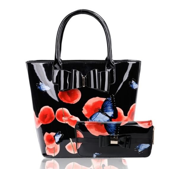 Stylish black handbag and wallet set with a floral and butterfly motif. Features a glossy finish and bow accents for a refined look. Perfect for adding a touch of elegance to any outfit.