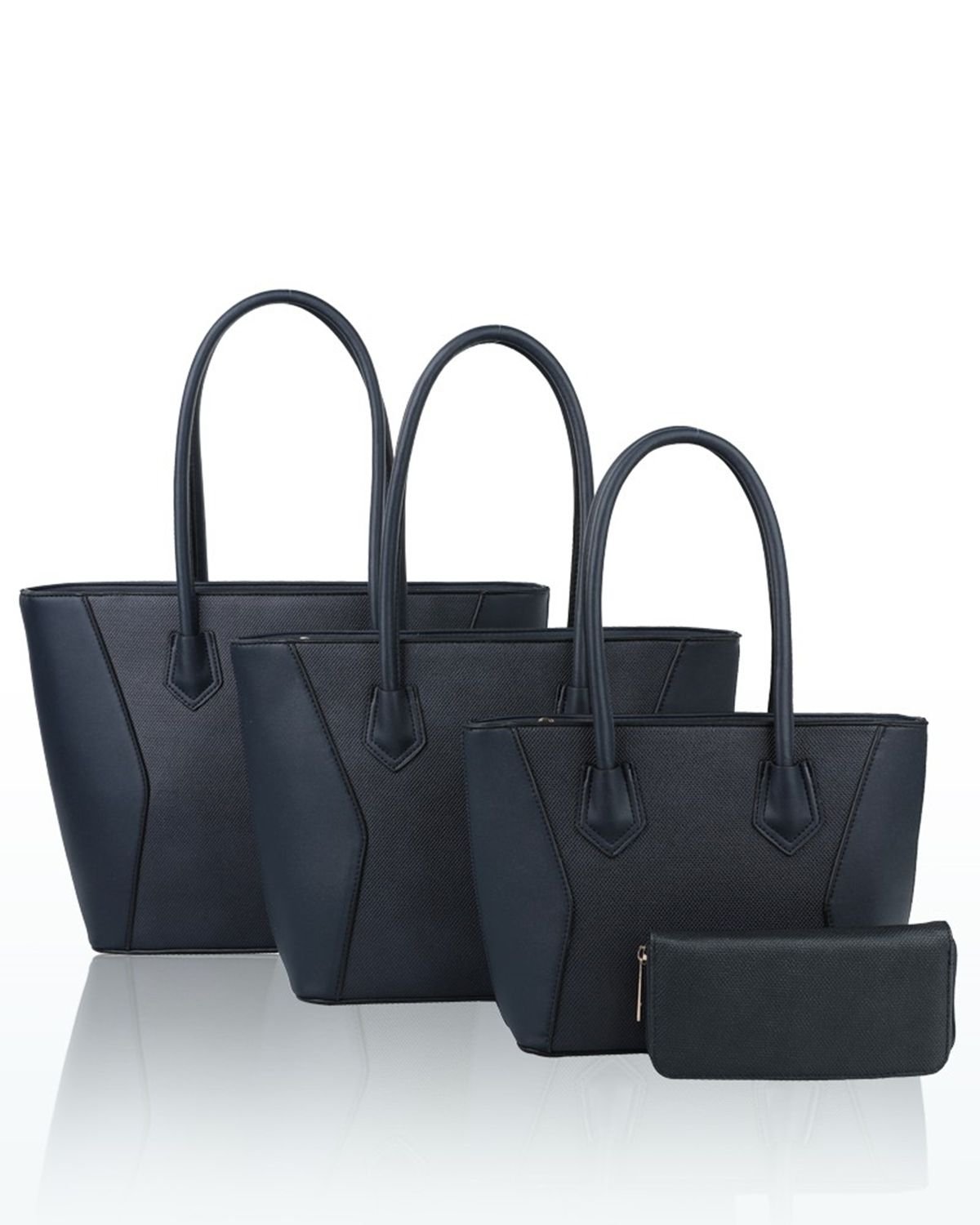 Stylish navy PU leather handbag set featuring three tote bags of varying sizes and a coordinating wallet. Sleek, minimalist design with sturdy handles and a structured silhouette, perfect for professional and casual settings.