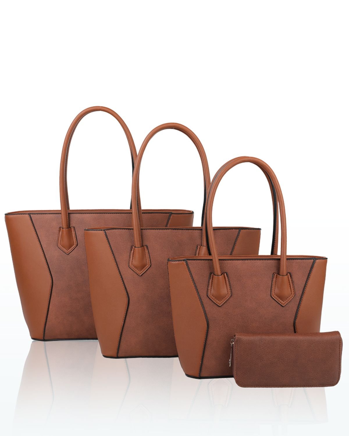 Stylish Fontanella Fashion matching handbag set in tan PU leather. Includes three tote bags of varying sizes and a coordinating zippered wallet. Sleek, minimalist design with sturdy handles and a structured silhouette, perfect for both professional and casual settings.