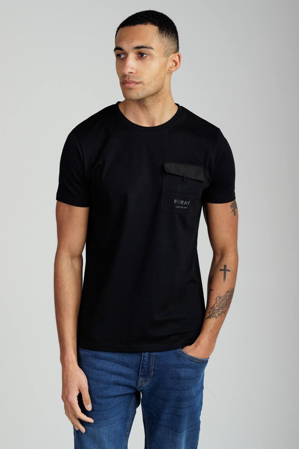Stylish black cotton crew neck t-shirt by Foray. Designed for comfort and breathability, this tee features a functional chest pocket with a subtle logo. Ideal for casual wear.