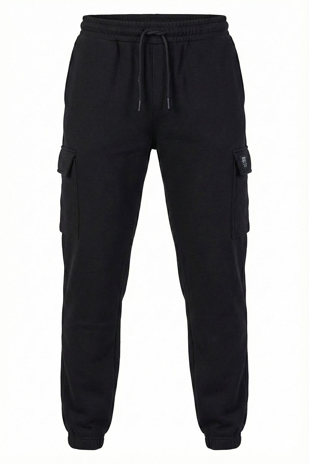 Modern cargo cuffed joggers in sleek black crafted from a soft cotton blend. Features include ribbed cuffs, cargo-style pockets, and subtle branding. Designed for a slim tapered fit with slight stretch for all-day comfort.