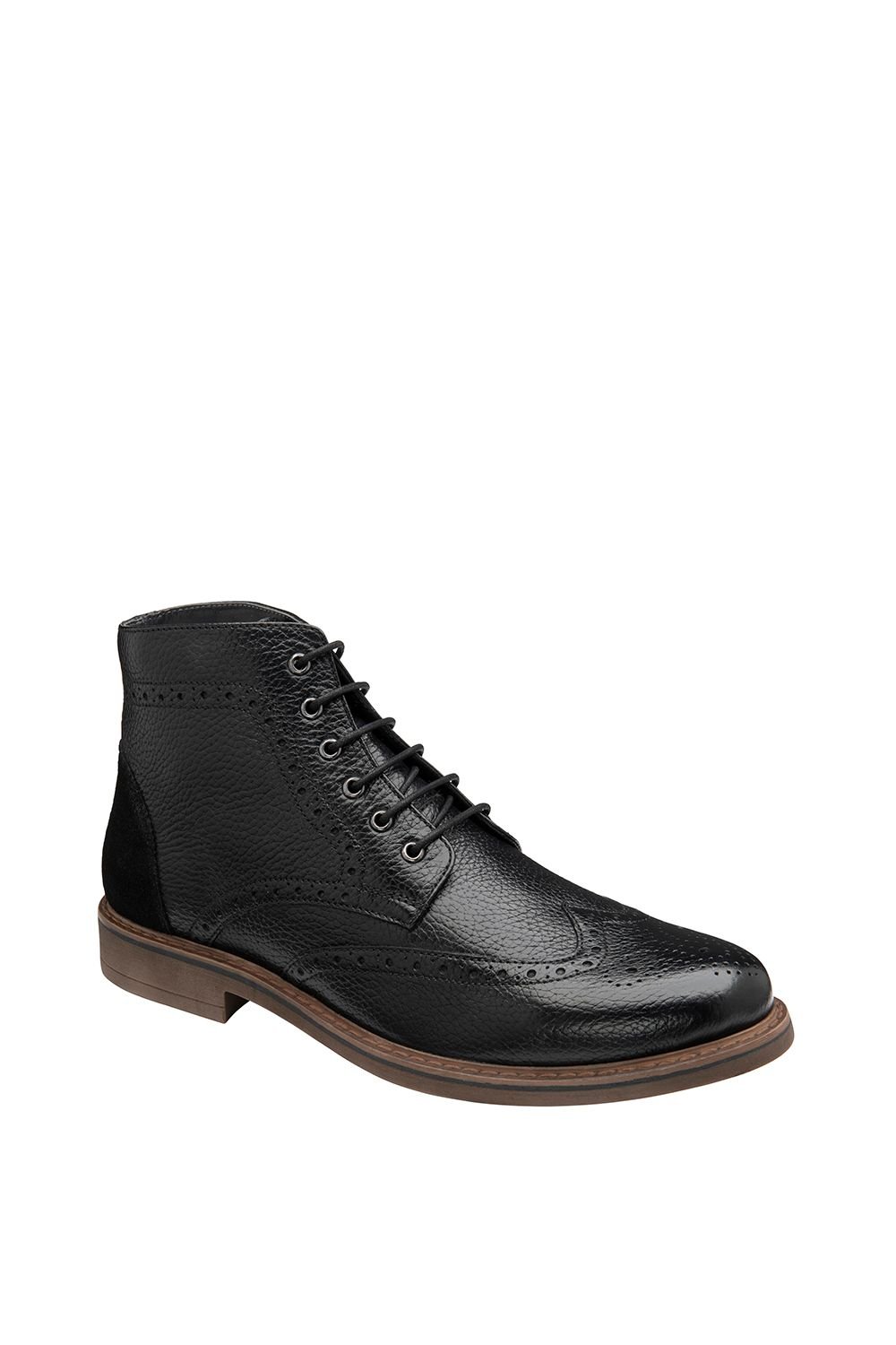 Stylish Frank Wright 'Magnus' ankle boot in black leather. Features brogue and wingtip detailing, a contrasting ankle trim, and a heel pull loop tab for easy wear. Ideal for casual and smart-casual outfits.