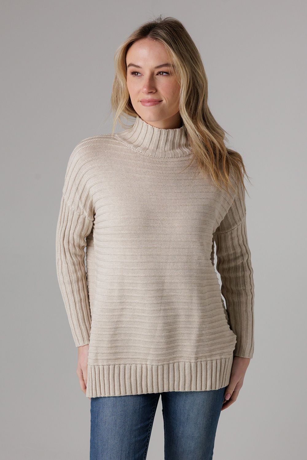 Luxurious beige cotton ribbed knit jumper with a high neck and long sleeves. Perfect for both casual and smart-casual occasions.