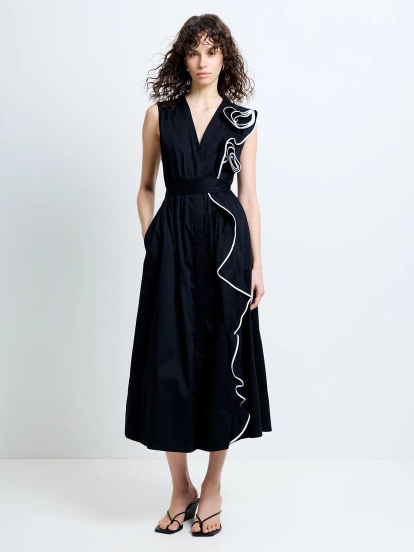 Monochrome midi corsage dress by French Connection. Features a V-neckline, elasticated and belted waist, invisible pockets, and a contrast tipped ruffle corsage detail. Made from poplin fabric, it's lightweight and perfect for various occasions.