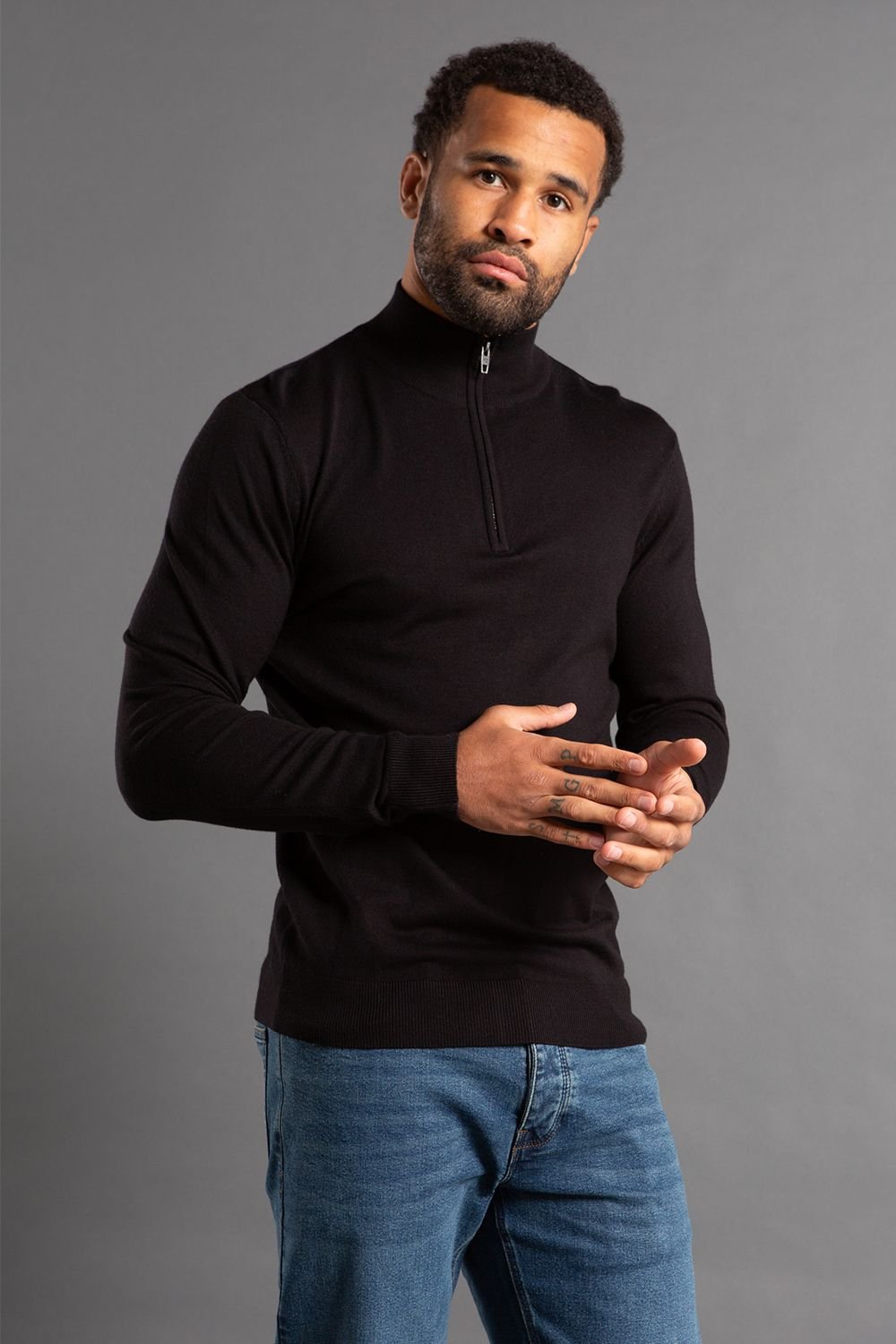 The French Connection Men's 1/2 Zip Knitted Jumper in Black is made from knitted, elastane.