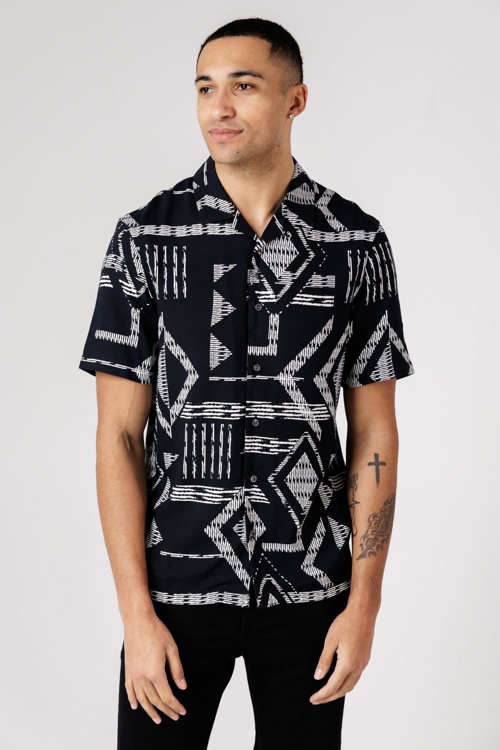 Stylish black tribal print shirt from French Connection. Features a revere collar and button-down fastening. Ideal for a relaxed summer fit.