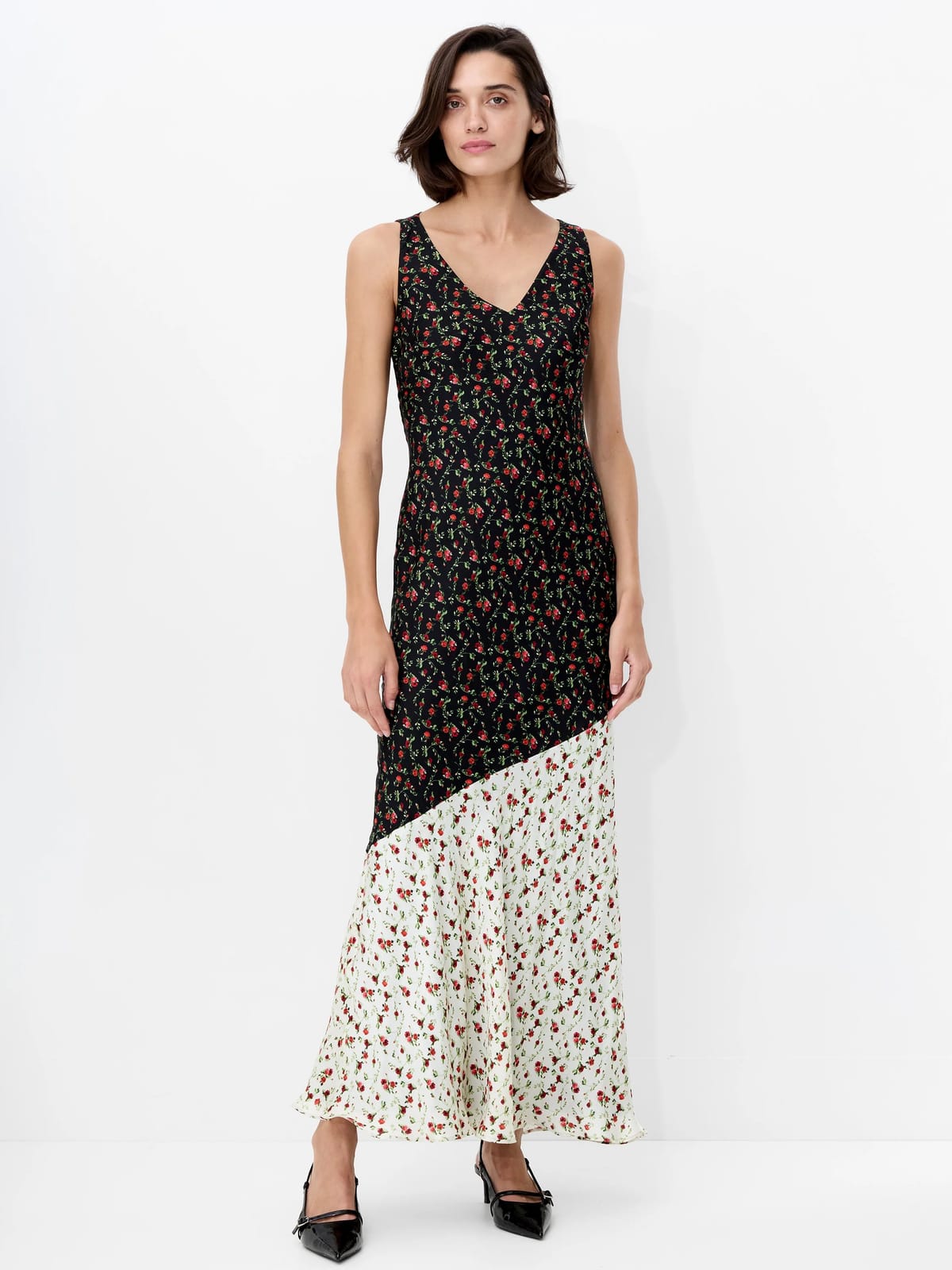 This two-tone floral dress by French Connection features a V-neckline and sleeveless design. Made from smooth fabric, it has a diagonal seam for added movement and shape. Ideal for casual and evening occasions.