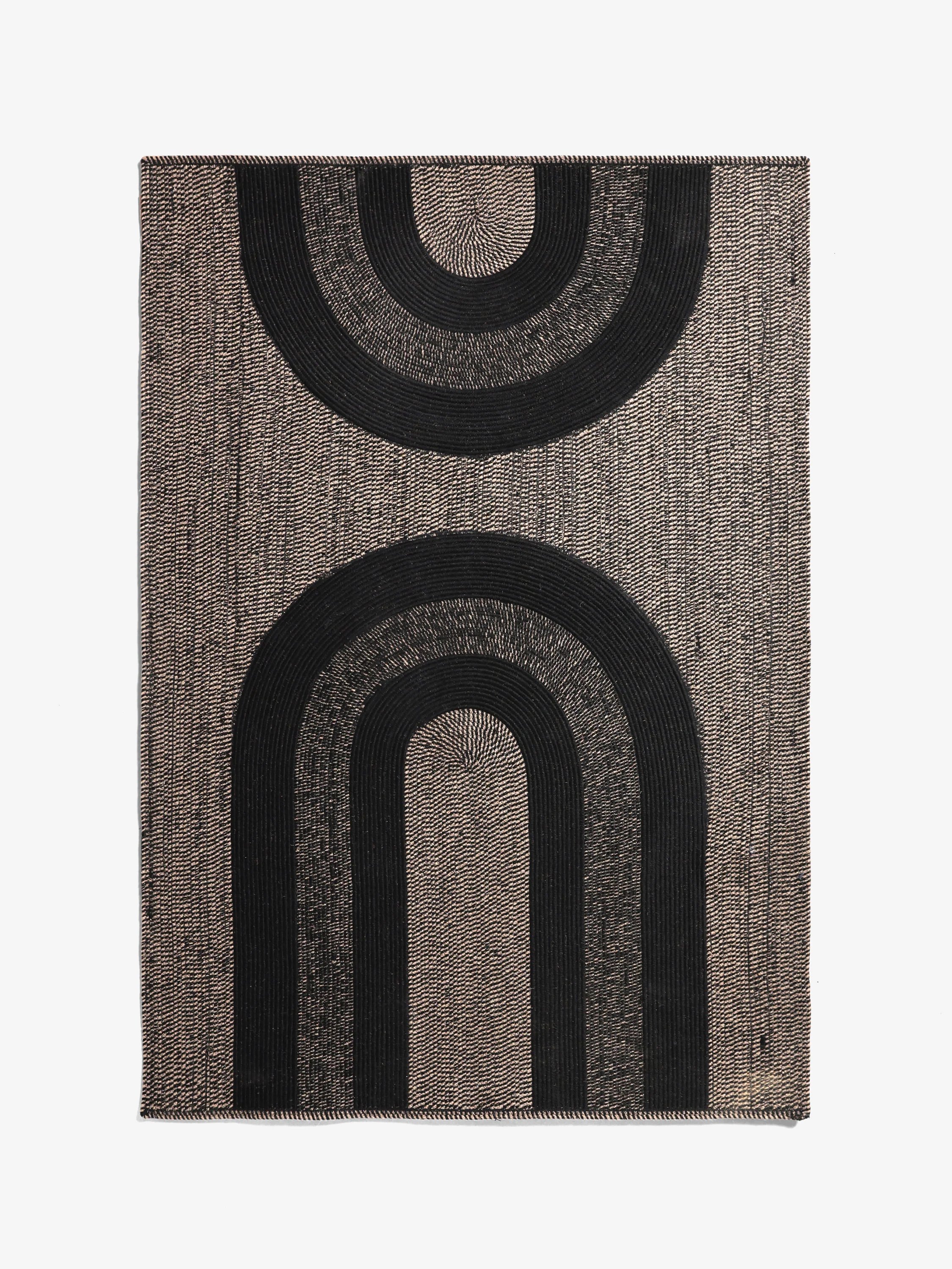 Stylish black and grey jute rug with a bold abstract design. Crafted from natural jute, it adds a grounded texture and graphic impact to any space.