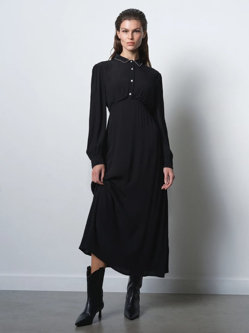 Refined, elegant and a touch of sparkle. This black midi dress features a diamante trimmed collar, diamante buttons, and a flattering empire waist. Made from sustainable ECOVERO™ viscose, it's perfect for evening events or date nights.