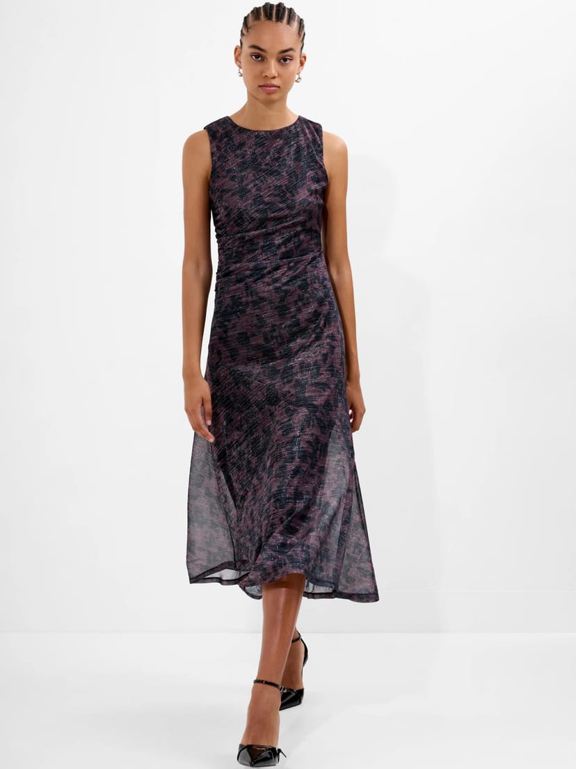 View French Connection UK's returns policyThis multi-coloured lurex round neck midi dress by French Connection features a metallic infused print and waist ruching for a flattering fit. The soft, patterned overlay fabric adds texture and movement with its softly flared hem. Ideal for evening events or special occasions.