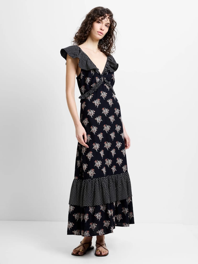 View French Connection UK's returns policyPlayful black multi cotton dress with a floral and polka dot print. Features a deep v-neckline, empire waist, contrasting ruffles, and a tiered hem. Perfect for casual and evening occasions.