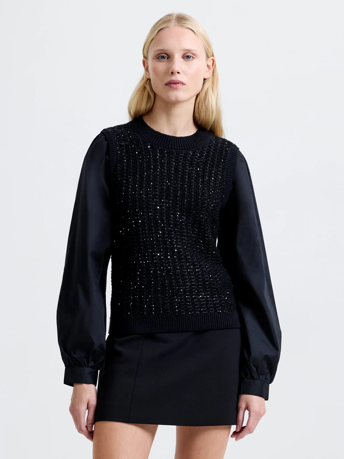 Luxurious black sequin jumper with a basketweave knit bodice and ribbed trims. Features contrasting long sleeves for a chic layered look. Ideal for evening events or special occasions.