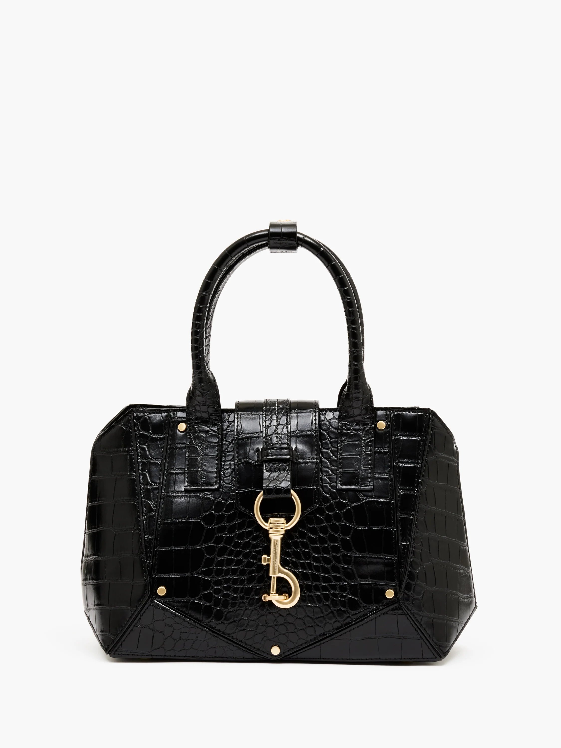 Sleek black croc textured handbag with a structured silhouette. Features glossy gold hardware, handles, and a removable strap. Practical with inner pockets.
