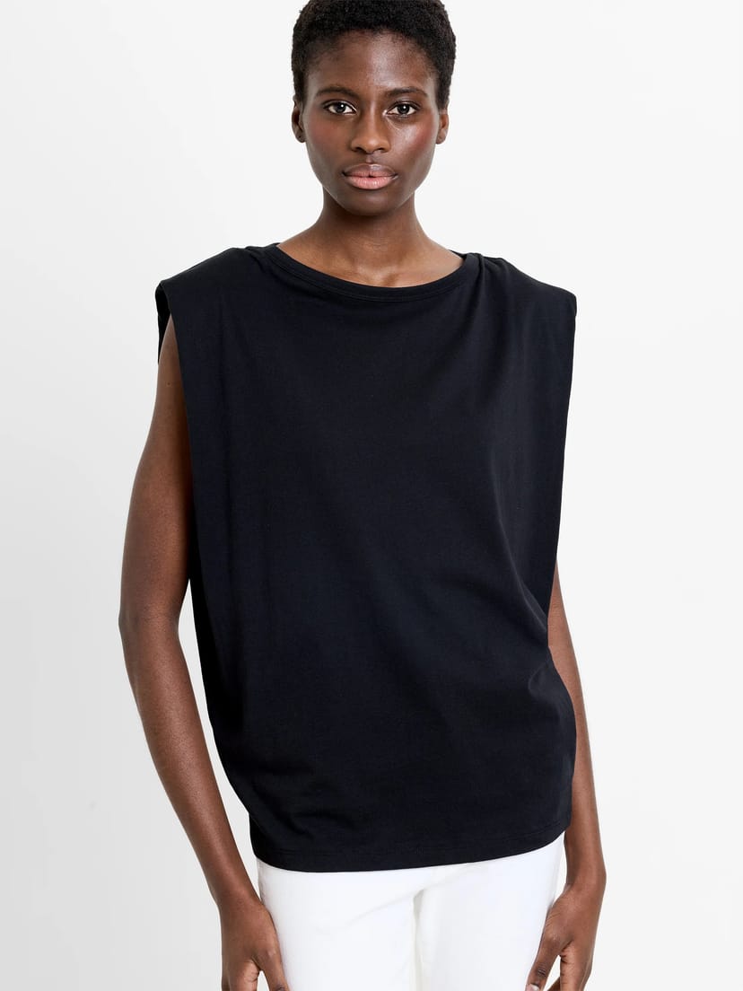 View French Connection UK's returns policyThis black sleeveless t-shirt from French Connection features a crew neckline and built-in shoulder pads. Made from soft, lightweight fabric, it offers a relaxed fit perfect for casual wear.