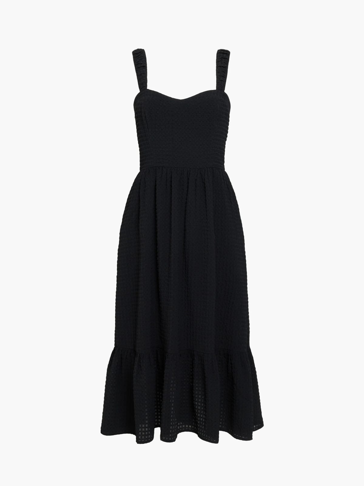 View French Connection UK's returns policyElegant black seersucker sweetheart dress with a gathered skirt and statement tie-back detail. Perfect for summer events or casual outings.