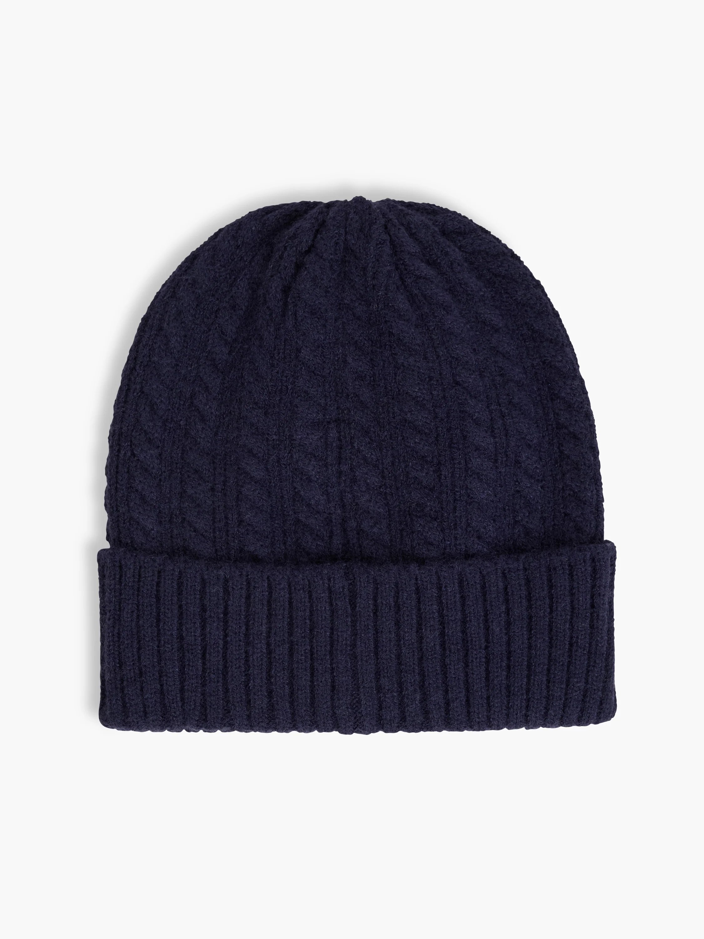 Classic and cosy comfort, brought to you by our Navy Blue Cable Knit Beanie Hat. This soft-touch hat features a cable knit body and ribbed turn-up cuff for warmth and timeless texture.