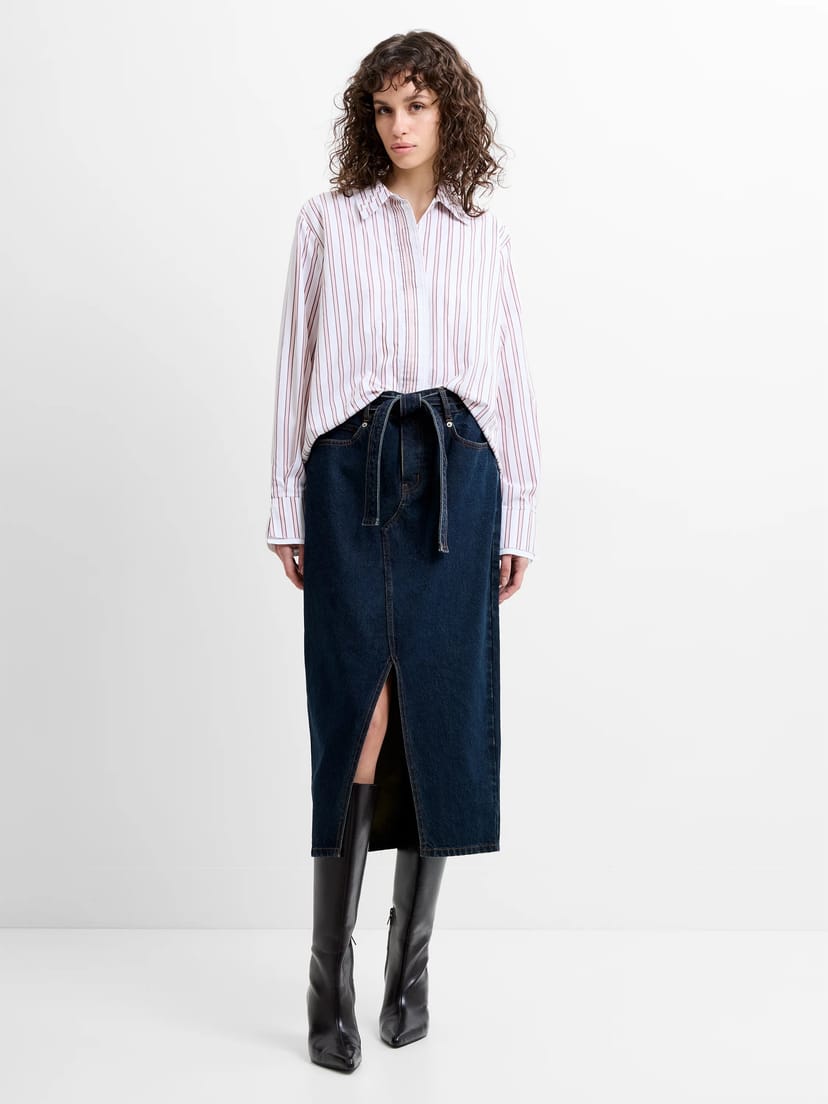 View French Connection UK's returns policyStylish dark indigo denim midi skirt from French Connection. Featuring a high-waist, belted waist, and front slit. Made from denim fabric with contrast stitching for a polished look. Ideal for casual and evening wear.