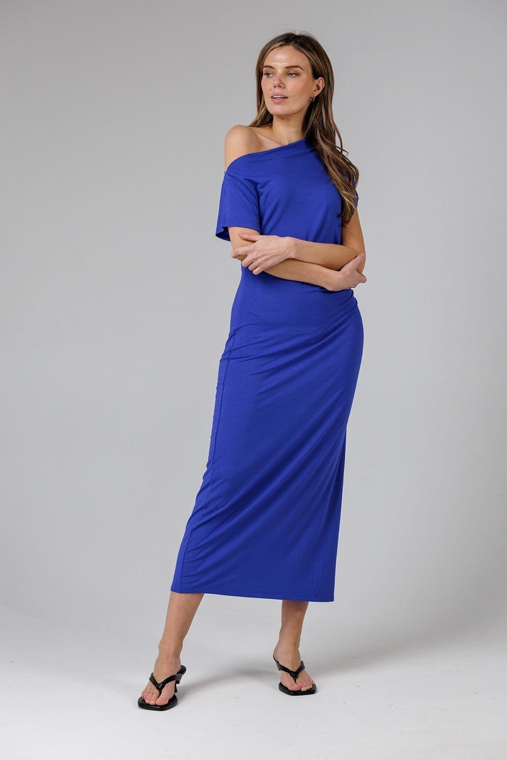 This sleek, ankle-length dress from French Connection is ideal for both formal and refined casual occasions. Features a minimal, modern silhouette, a high boat neckline, short sleeves, and a subtle gathered detail at the waist that adds gentle shaping. The smooth, streamlined design gives it an elegant appeal.