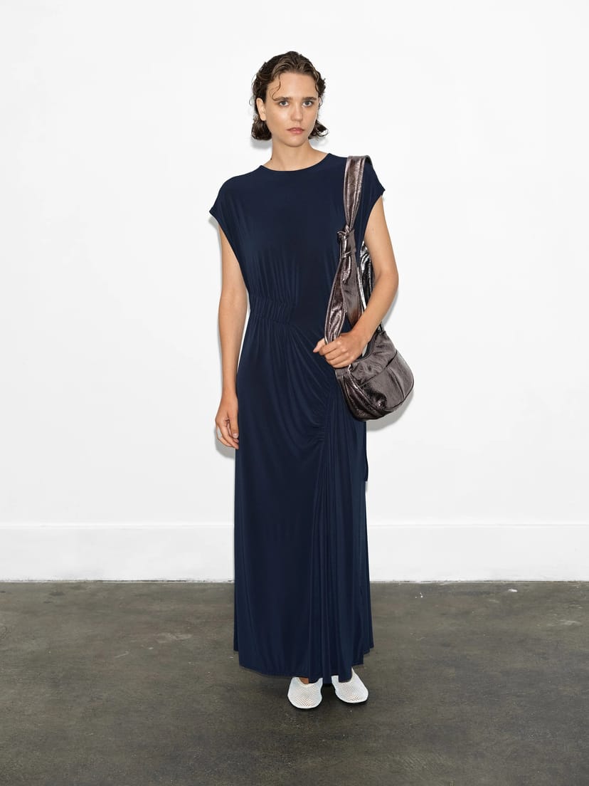Elegant maxi dress in navy blue jersey with a round neckline and cap sleeves. Features gathered side details with a self-tie drawstring for a flattering fit. Perfect for relaxed yet refined occasions.