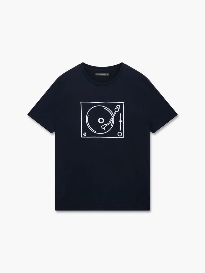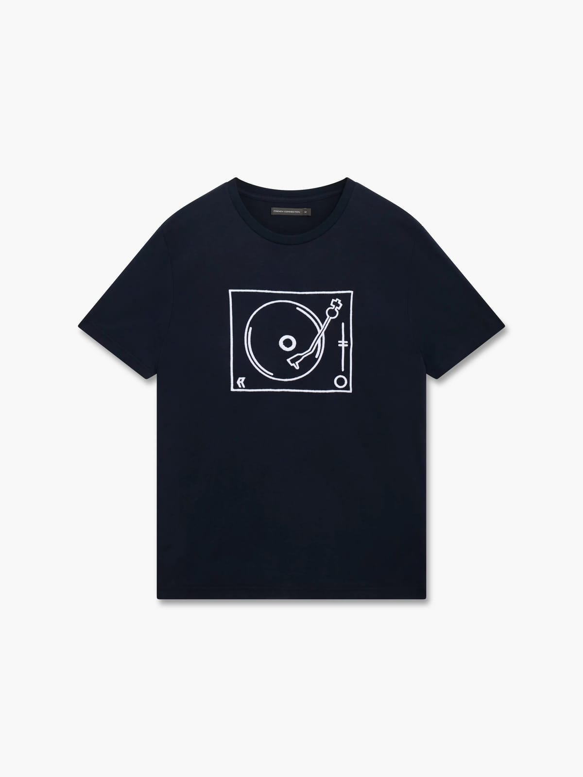 View French Connection UK's returns policyThis navy blue T-shirt from French Connection features a classic crew neckline and short sleeves. It boasts a soft cotton fabric and a distinctive embroidered turntable graphic on the front. Ideal for a casual, everyday look.