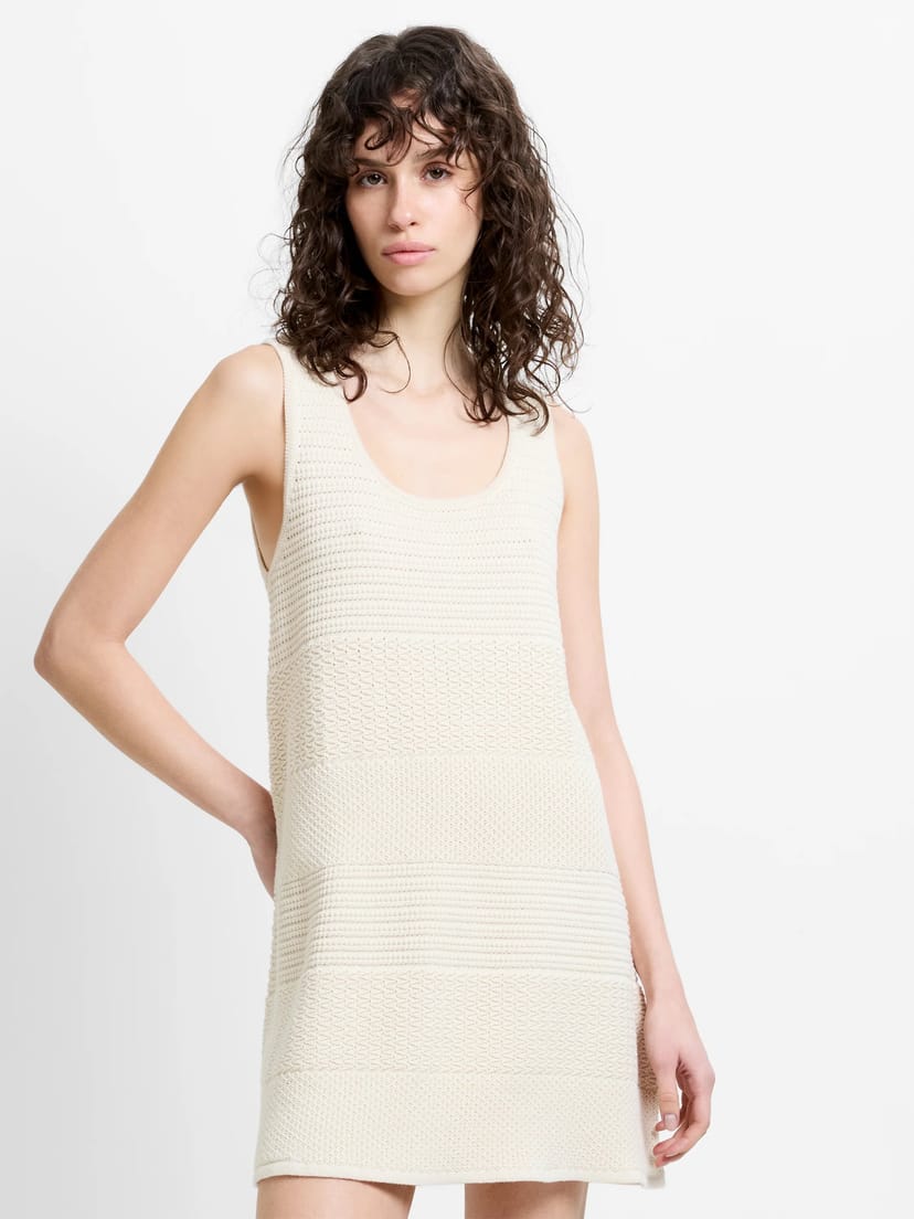 View French Connection UK's returns policyStylish cream knit mini dress with a horizontal striped pattern and mixed knit stitches for a modern look. Features a straight silhouette and a scoop neckline. Perfect for casual outings.
