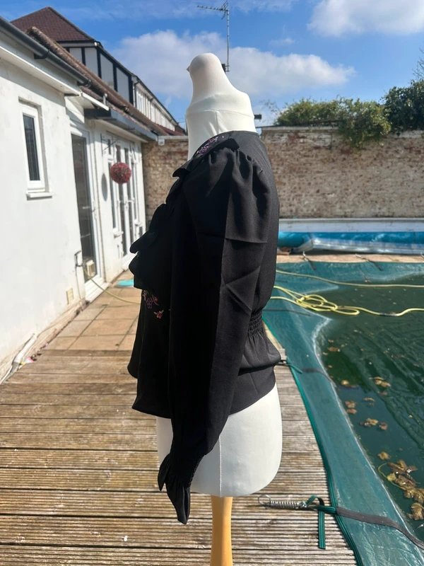 This stunning French Connection blouse is in black featuring intricate floral embroidery with sequin detailing across the front panel. Designed with a flattering V neckline, soft ruffled trim, and a peplum-style hem for a feminine silhouette. Lightweight fabric with a slight drape, making it ideal for both day to evening wear.