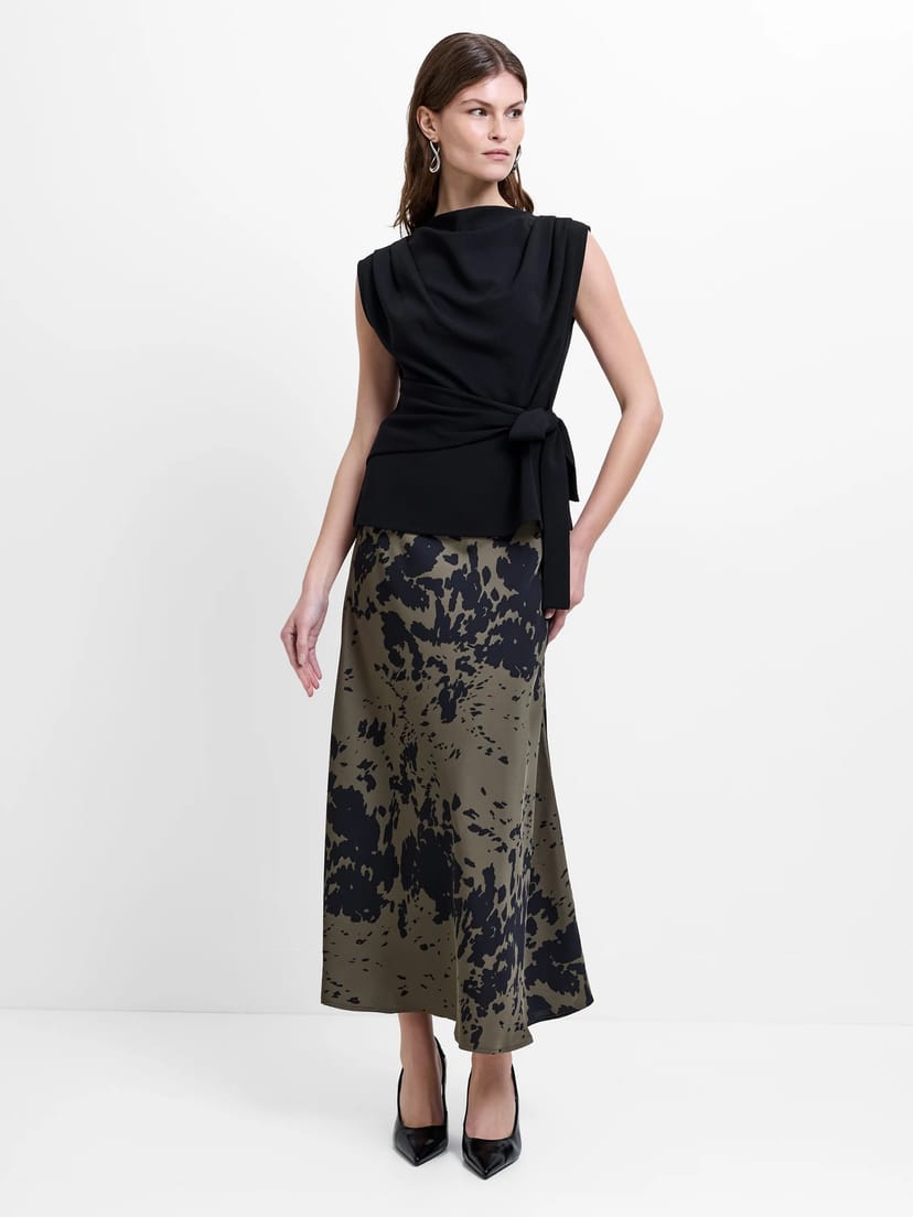 This khaki green satin midi skirt from French Connection features a fluid drape and flattering midi length. The abstract print adds a hint of personality. Ideal for evening or date-night occasions.