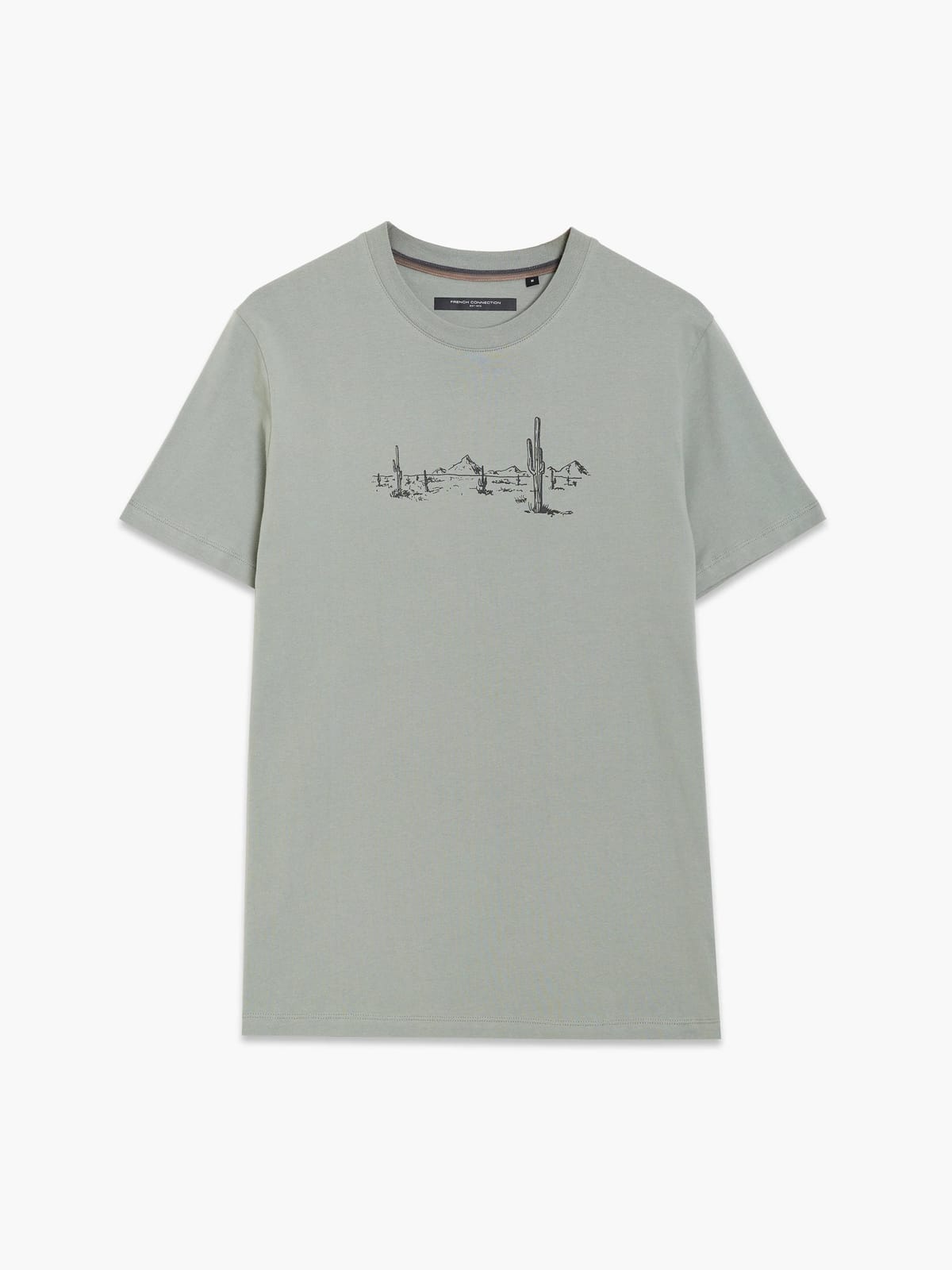Casual short-sleeve tee in shadow green organic cotton. Features a crew neckline and a desert scene graphic print. Perfect for relaxed, everyday wear.