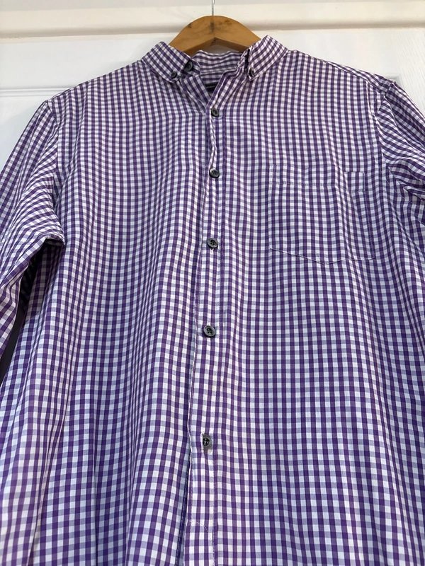 Purple and white gingham casual shirt — the perfect blend of style and comfort. Designed with gingham pattern, long sleeve, button-down front, spread collar, cotton. Features a versatile look for casual and smart-casual occasions.