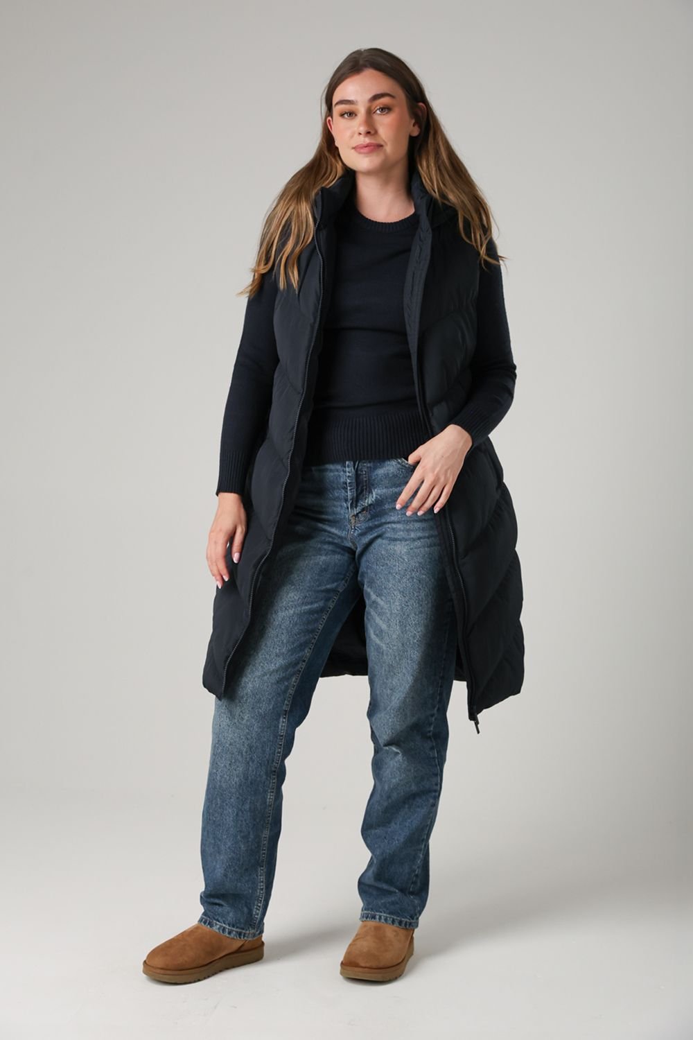 Stylish navy quilted gilet from French Connection. Features a full zip, two front pockets, and a detachable hood. Ideal for chilly outdoor days, providing warmth and style.