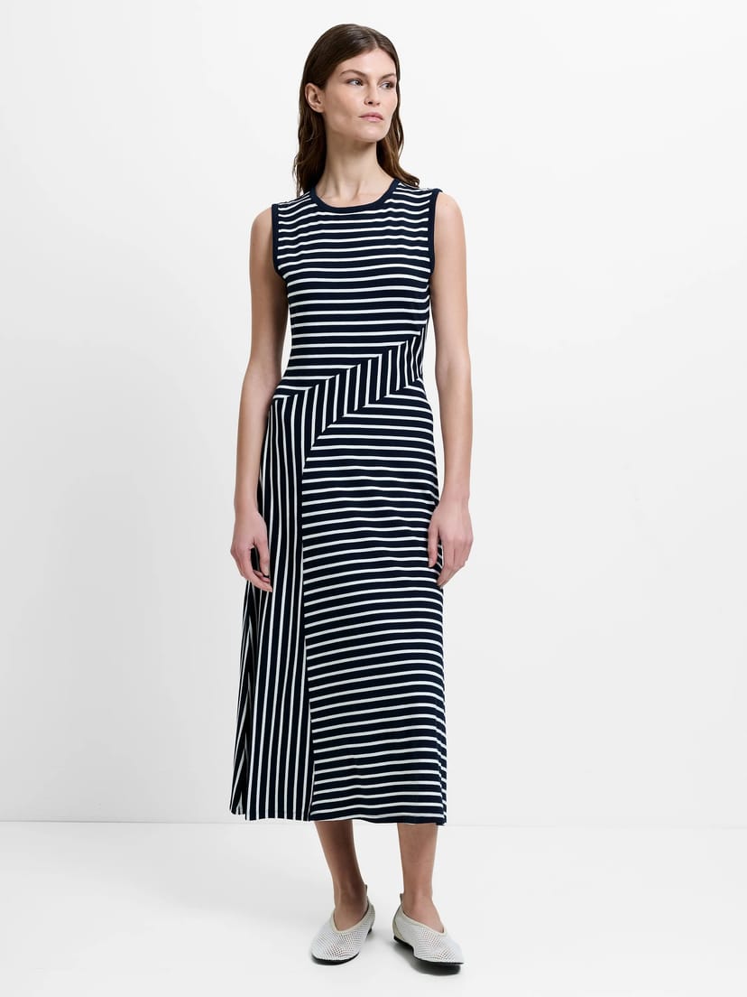 The French Connection Navy/White Striped Sleeveless Midi Dress is ideal for casual, daytime.