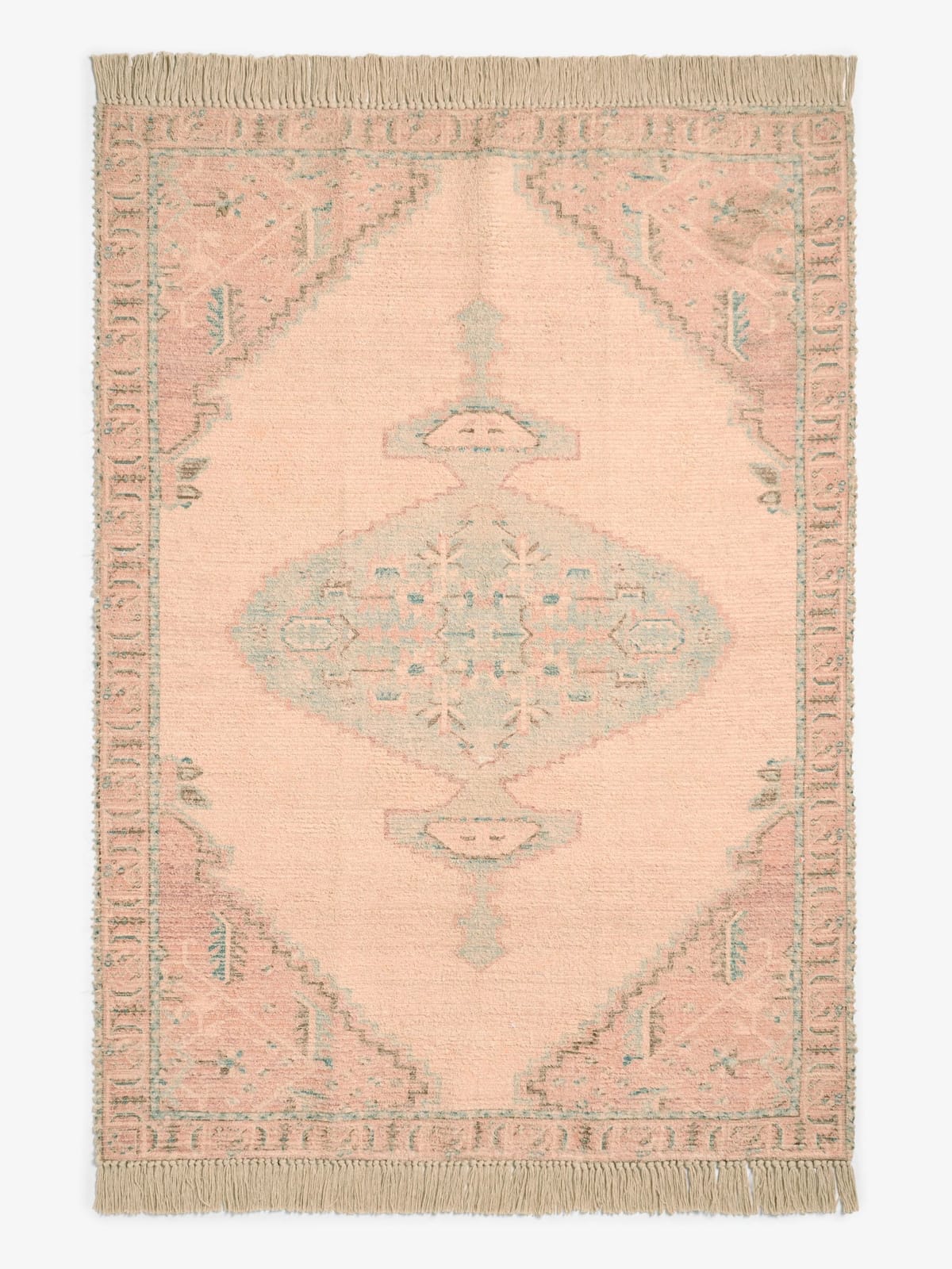 Charming pale pink flatweave rug by French Connection. Made from cotton chenille, it features a vintage-inspired medallion design with frilled edges and a soft washed finish. Ideal for adding a touch of elegance to any room.