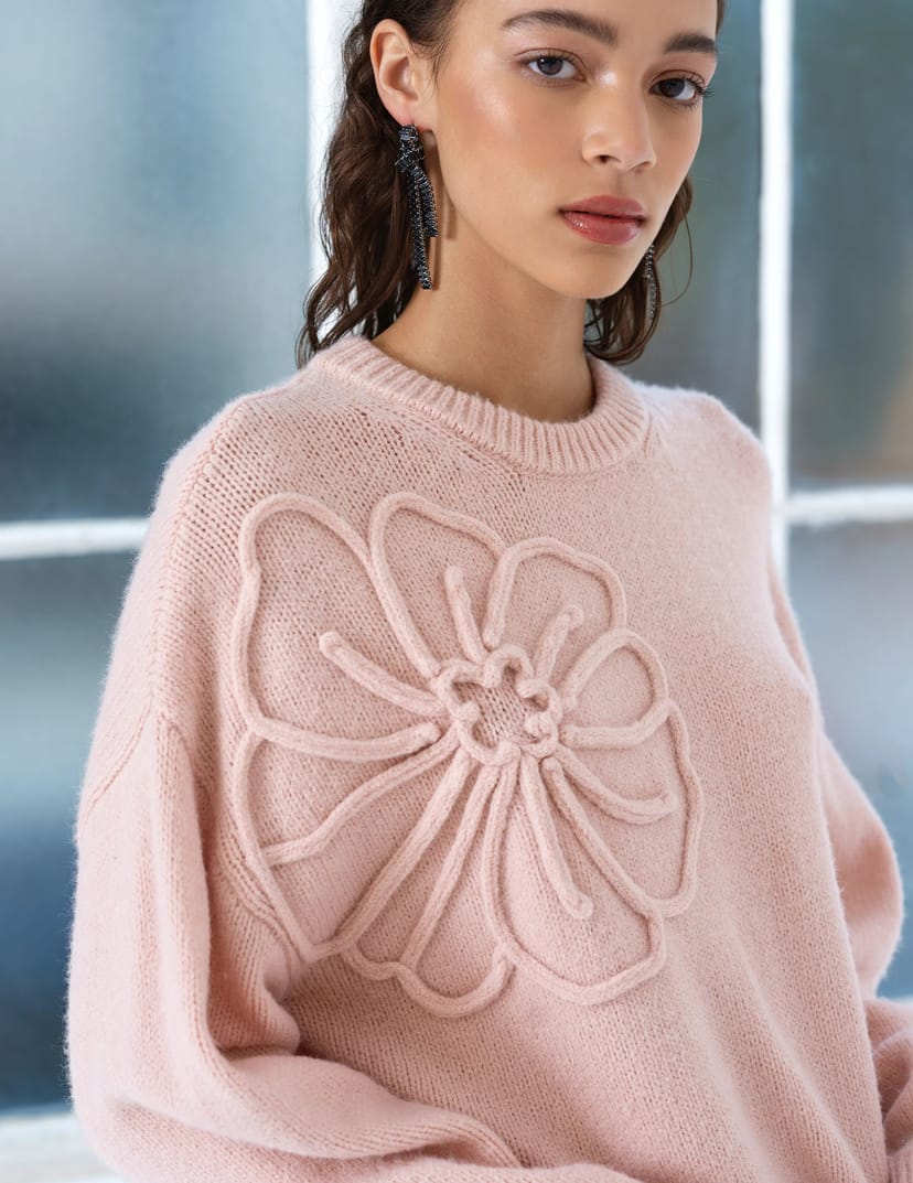 Elegant pink jumper with a floral motif design. Made from soft knit fabric, it features drop shoulders and long balloon sleeves with ribbed cuffs. Perfect for casual and smart-casual looks.