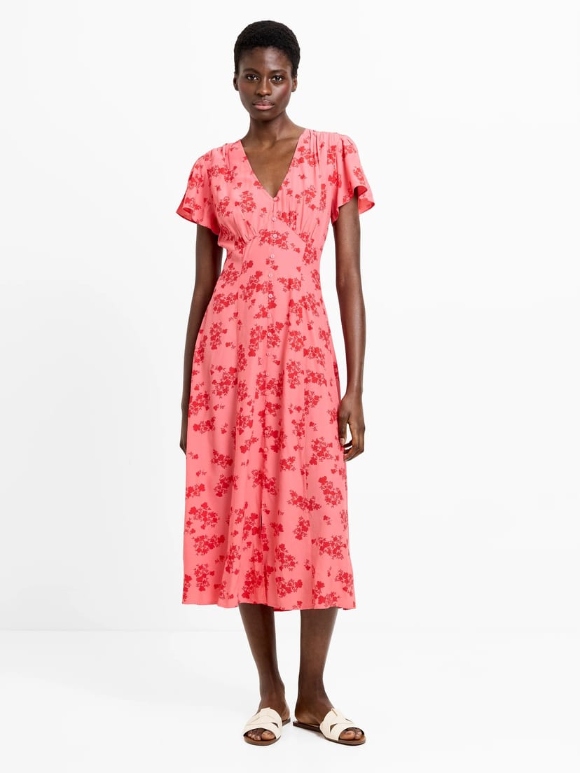 See all outfit ideasFloat into the season with this beautiful floral midi dress. Featuring flutter sleeves and an empire waist, this dress has a V-neckline and faux button details. Made from sustainable viscose fibres called ECOVERO™.