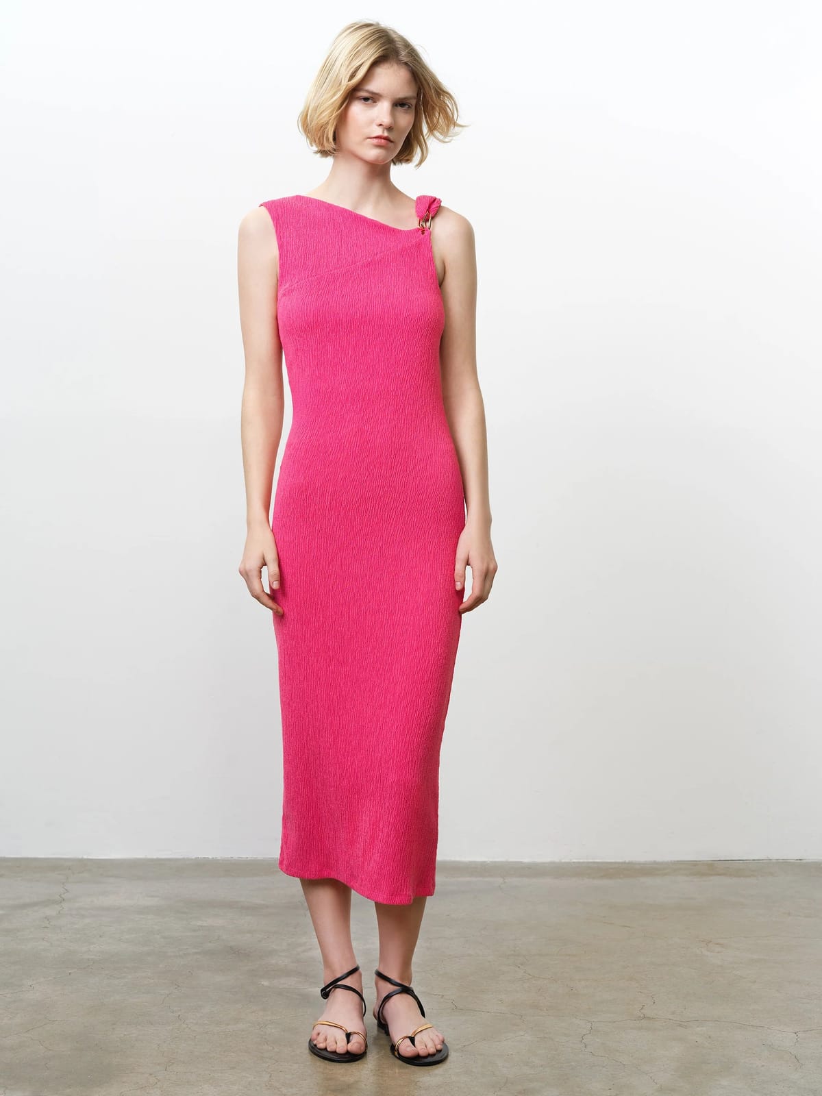 View French Connection UK's returns policyThis Fuchsia Pink Midi Dress by French Connection features a soft, textured finish and a body-contouring silhouette. The dress boasts an asymmetric neckline and a gold tone ring accent for a touch of elegance. Ideal for evening events or date nights.